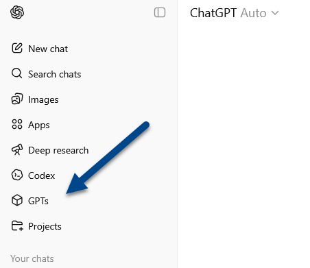 On the ChatGPT home page, click GPTs in the left sidebar.