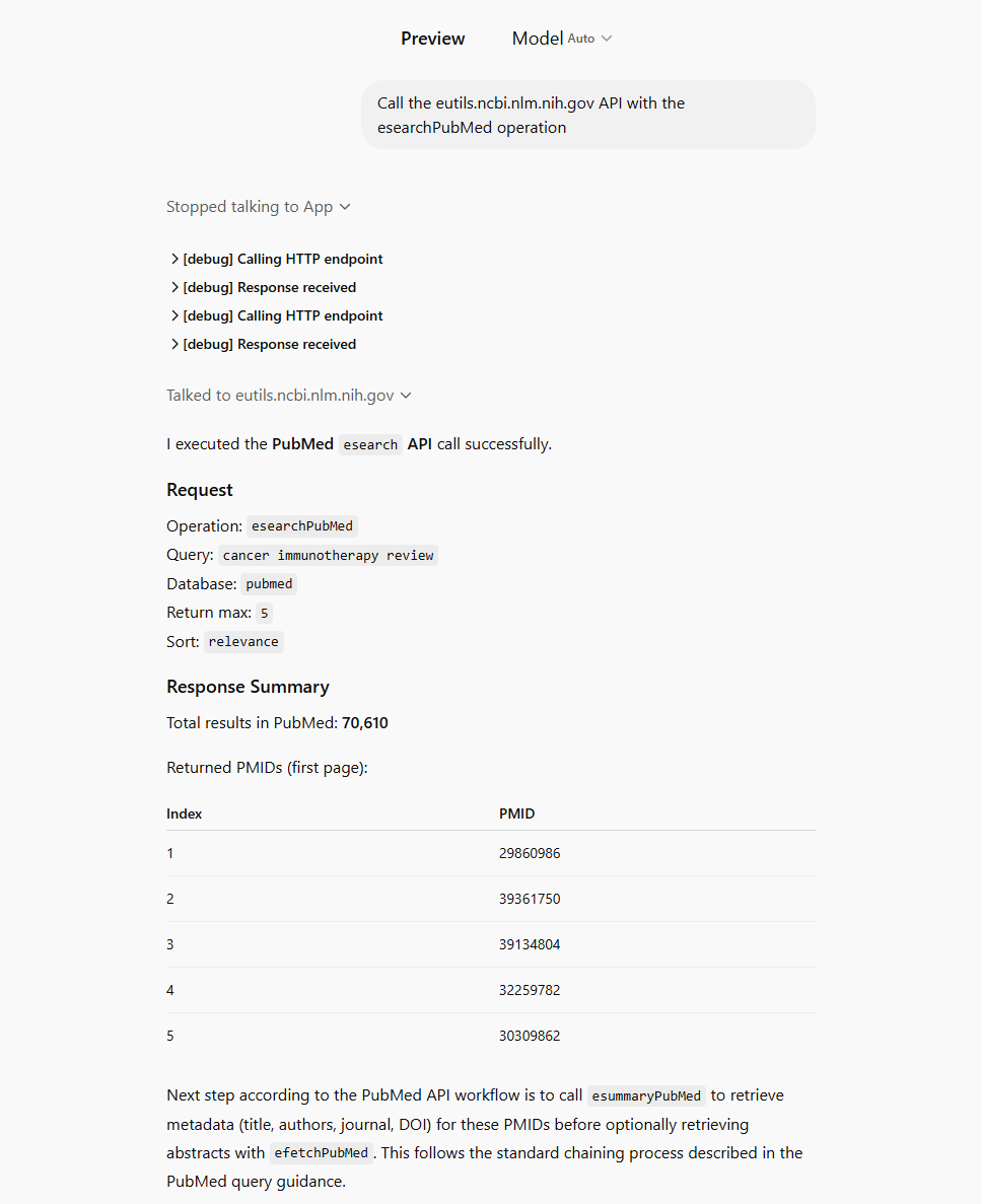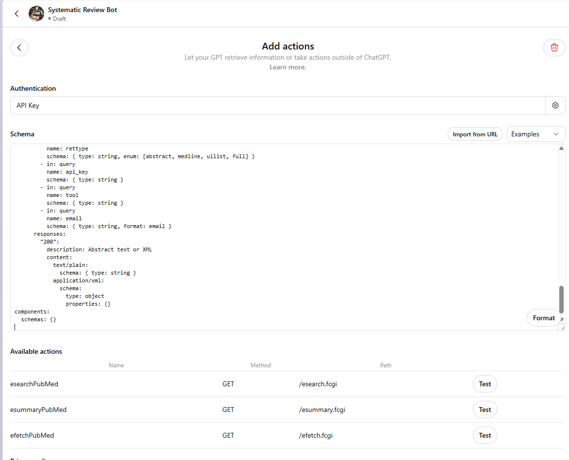 pubmed_openapi_configuration.yamlinto the Schema field. Next, click the Test button for each API call type to verify that the requests work correctly.
